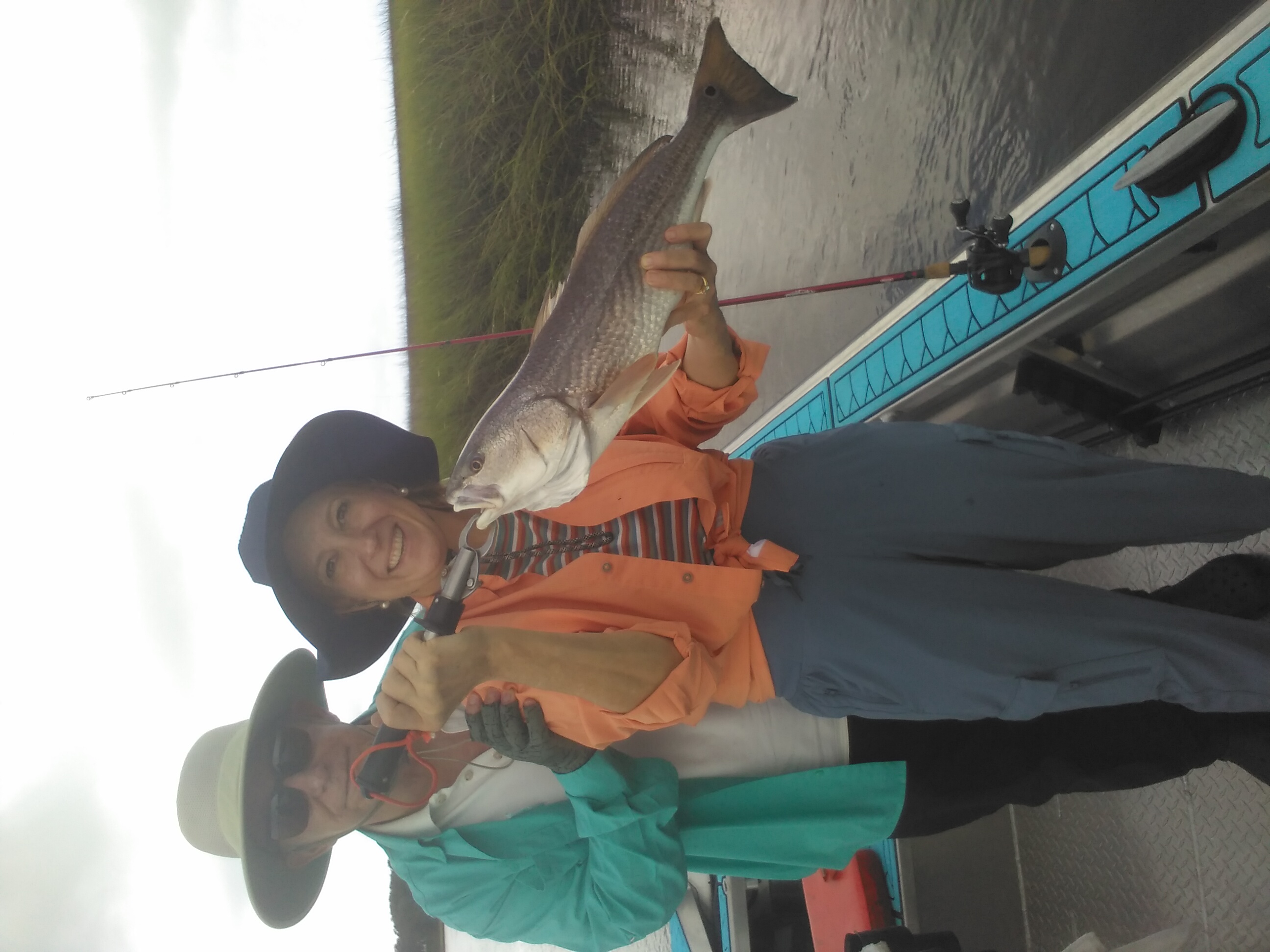 OCTOBER 8, 2025 HUSBAND & WIFE FROM ''GUATEMALA'', ORIGINALLY PICKED 10/9 AND THE FORECAST WAS SCA-25 KNOTS. THE FULL MOON OCTOBER TIDES MADE THIS DAY CHALLENGING ENOUGH SO WE WENT ON 10/8 INSTEAD AT HIGH TIDE. NEEDING "LOWER WATER" TO CATCH ANY FISH UP IN THE MARSH. STARTED OUT CASTING JIGS & SHRIMP, FOR JACKS AND LADYFISH. LOADS OF BITES NOT MANY HOOK UPS. AS THE TIDE DROPPED WE ENDED UP GOING TO MY FLOAT-RIG SET-UPS AND BAIT CASTING TACKLE AND LIVE SHRIMP. THEY ENDED UP WITH 3 REDFISH, TWO PERFECT "KEEPERS". BUT AS THE TIDE GOT "PERFECT", AND THE BAIT FISH (MULLET) STARTED SHOWING UP ALL AROUND US. THEY WANTED TO GO IN AND CALL IT A DAY, AT 3:30pm. "OK, WHATEVER YOU WANT" .... I WAS READY WITH PLENTY OF LIVE SHRIMP TO CATCH MORE REDFISH. THE CHALLENGE WAS REAL TODAY, AND WE WERE ON THEM, NOW. WE SWITCHED DAYS, WE SWITCHED TIME OF DEPARTURE, WE HAD TO WAIT ON THE TIDE, WE BARELY AVOIDED 2-3 RAIN STORMS PASSING BY, AND WE AVOIDED ANY HIGH WINDS. I WAS READY TO GET ON MORE REDFISH.