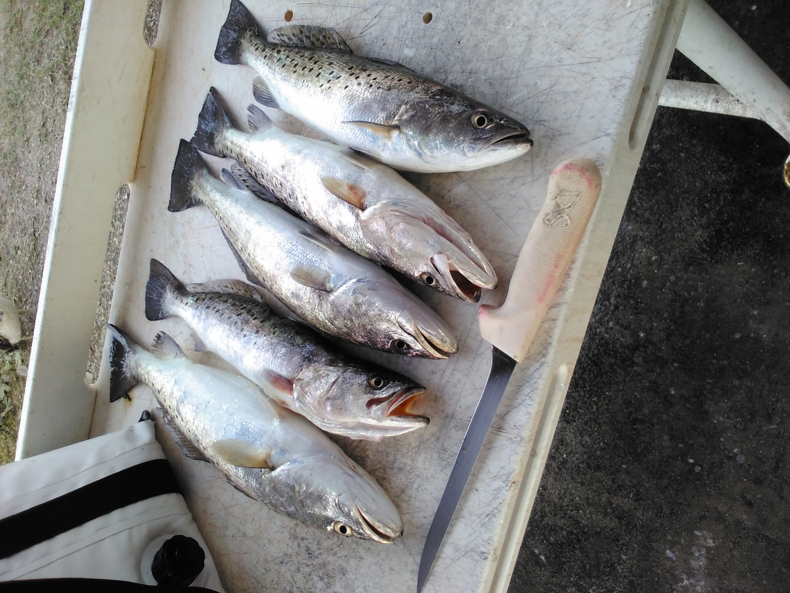 WENT OUT TO CHECK MY TRANSDUCER PLACEMENT ON MY NEW 12' SIMRAD SOUNDER/GPS/CHART PLOTTER, AND WHILE CRUISING AROUND, DECIDED TO FISH THE PERFET TIDE, FOR MY FAVORITE FISH, THE SPECKLED SEA TROUT. I CAUGHT A DOZEN EASILY AS THE TIDE GOT EVEN MORE PERFECT ON A OLE FAVORITE SPOT IN A CREEK. CASTED MATRIX SHAD SOFT PLASTICS ON A JIG HEAD, AND WACKED AND STACKED A DOZEN TROUT IN NO TIME. WENT BACK AND FILLETED MY WHOPPING 5 THE STATE ALLOWS THESE DAYS.
